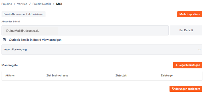 Nachdem du ein Outlook-Konto mit einem Projekt verknüpft hast, kannst du ein Mail-Abonnement erstellen und deine Mails in Aktenplatz importieren.